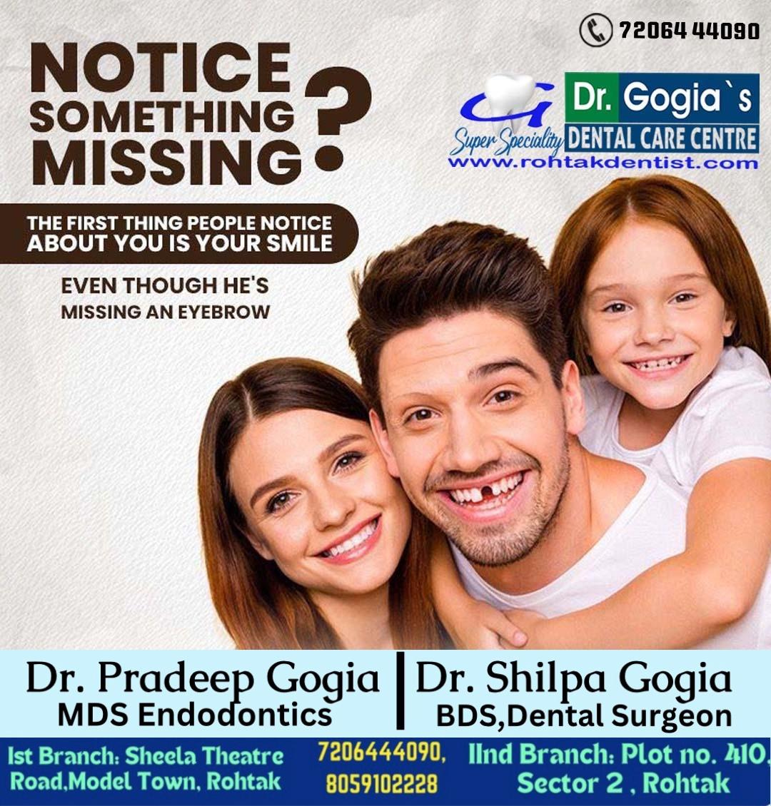A missing tooth can affect more than your appearance—it can lead to long-term dental problems. The good news? With the right treatment at the right time, you can restore your full smile and confidence. At Dr. Gogia’s Super Specialty Dental Care Centre in Rohtak, we’re here to offer personalized, compassionate, and advanced care.
